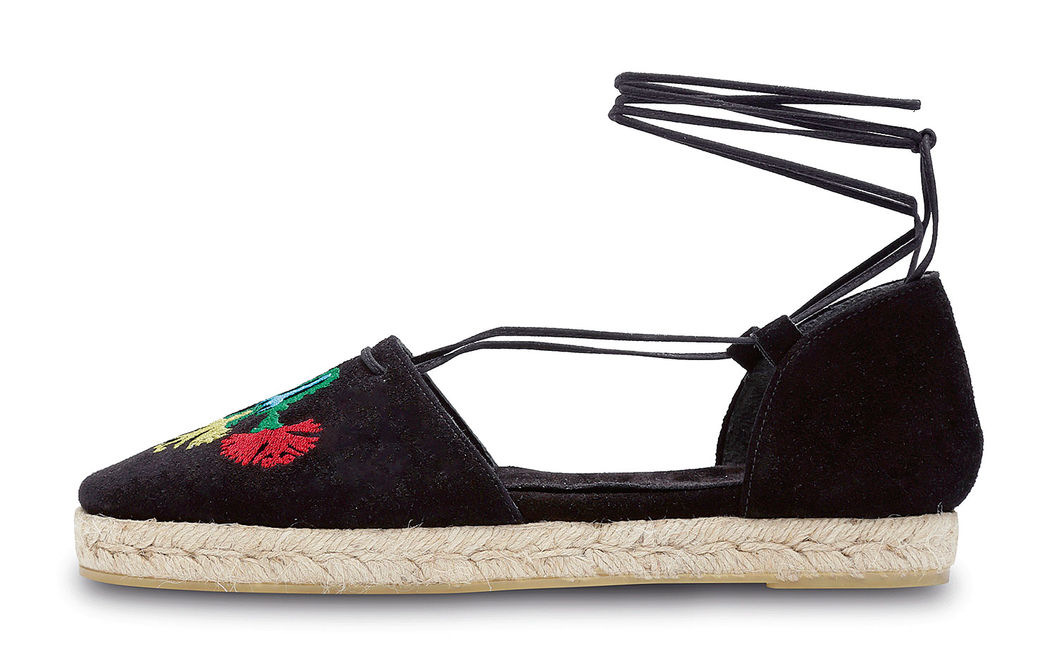 Σουέντ εσπαντρίγια, κεντημένη με κρητικό μοτίβο, που δένει στον αστράγαλο.