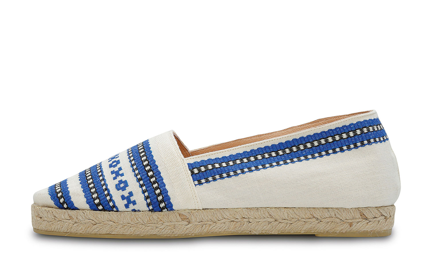 Εσπαντρίγια με δέρμα γίδας και μεταποιημένο υφαντό από vintage πουκάμισο.